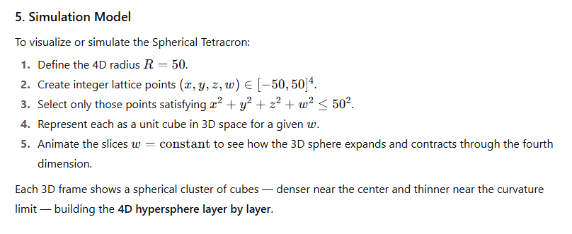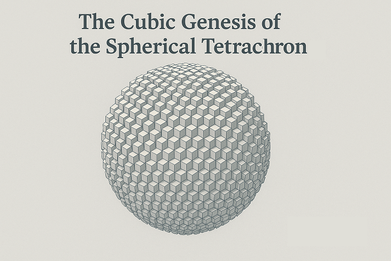 In its spherical version, this accumulation occurs isotropically: the 3D cubes expand and organize themselves under equal pressure in all directions, producing a four-dimensional equilibrium sphere — the Spherical Tetrachron.