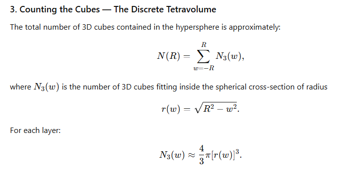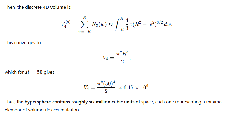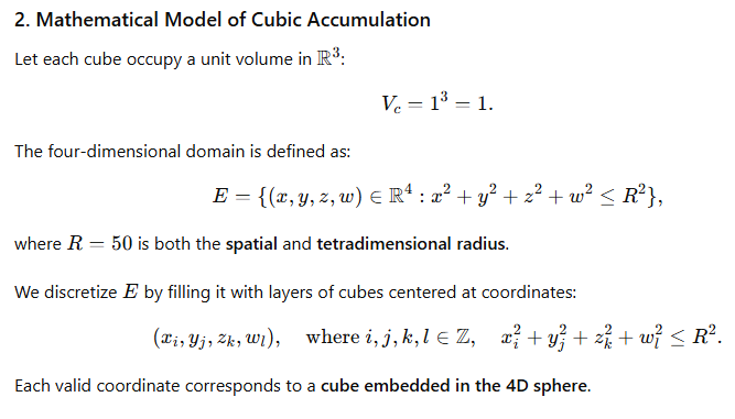 It is both mathematical and physical — a 4D space whose curvature, symmetry, and balance arise directly from the simple act of accumulating identical volumes within a finite boundary of equilibrium.